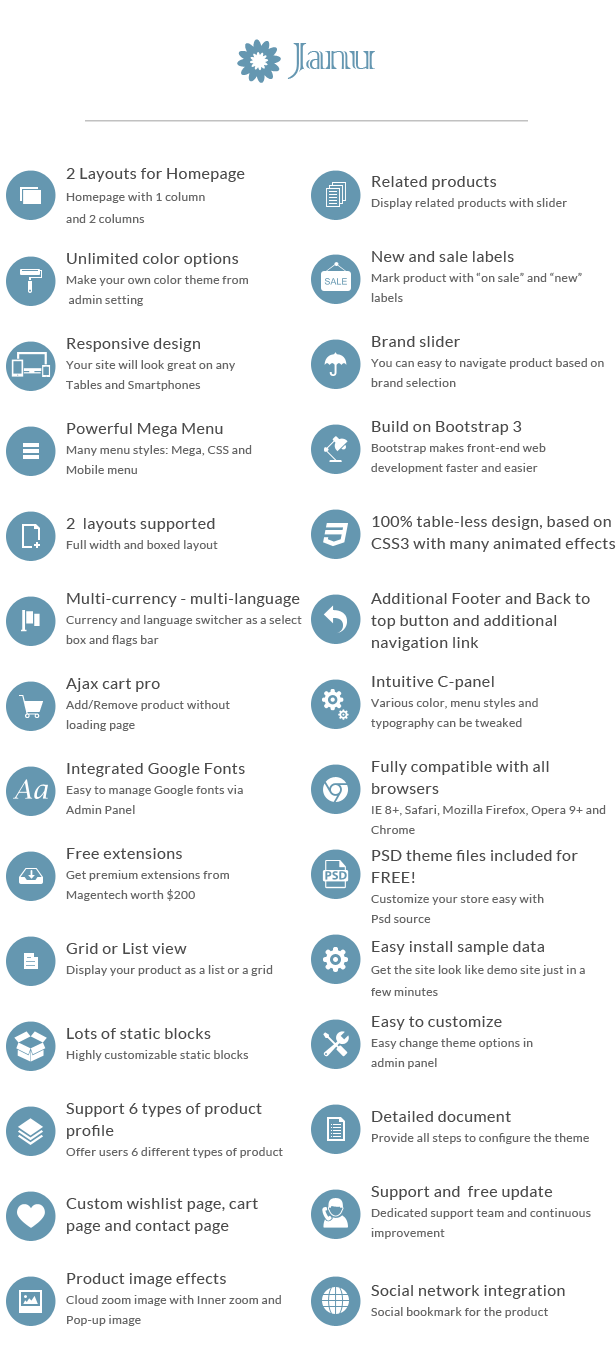 Does your website work well to engage your customers? Are you looking for a solution to attract more visitors? Today we proudly introduce our new template – Janu which we can be sure that you will not be disappointed and enjoy it as much as we do. This theme is another luxurious theme from Magentech with flat design, perfect color combination and well structured layout, 2 Hompage layouts, 2 menu types… and much more cool features.