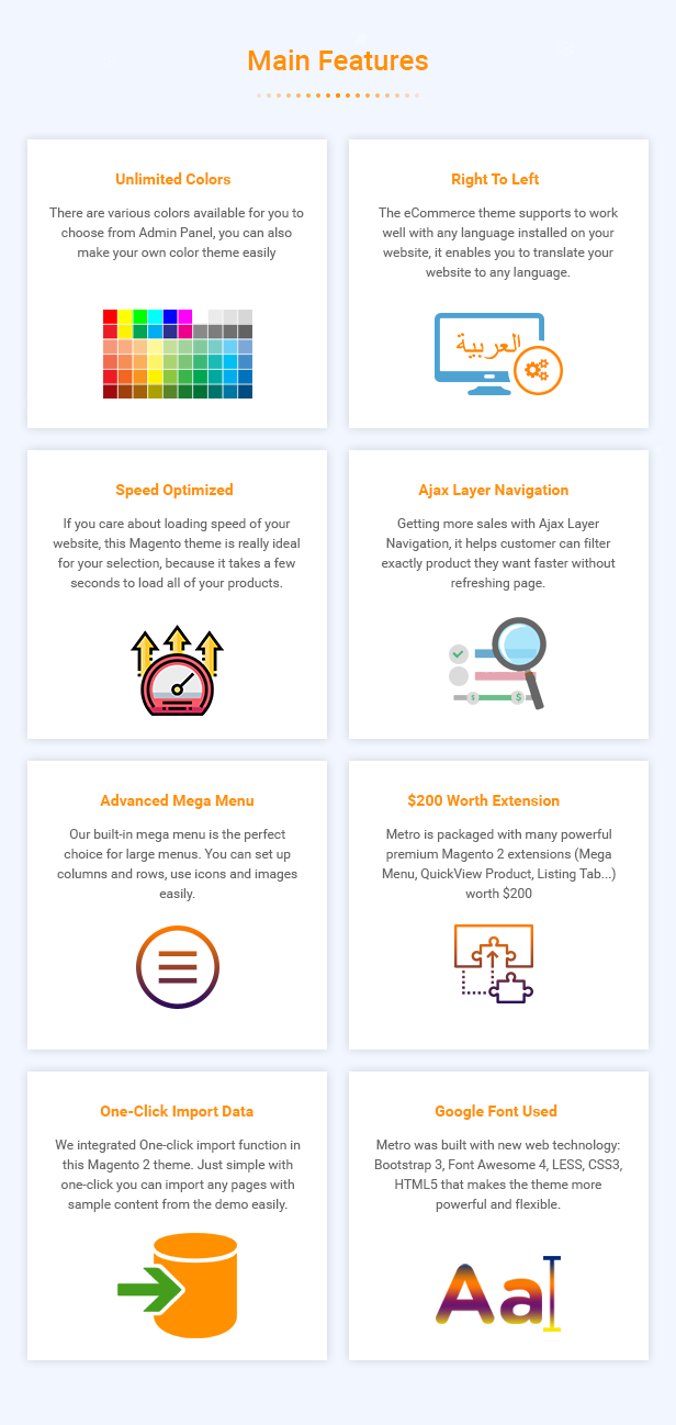 Empowered by the fantastic Magento 2 and various powerful eCommerce features, Metro helps you to build any beautiful website for almost store types without cost and time for coding.