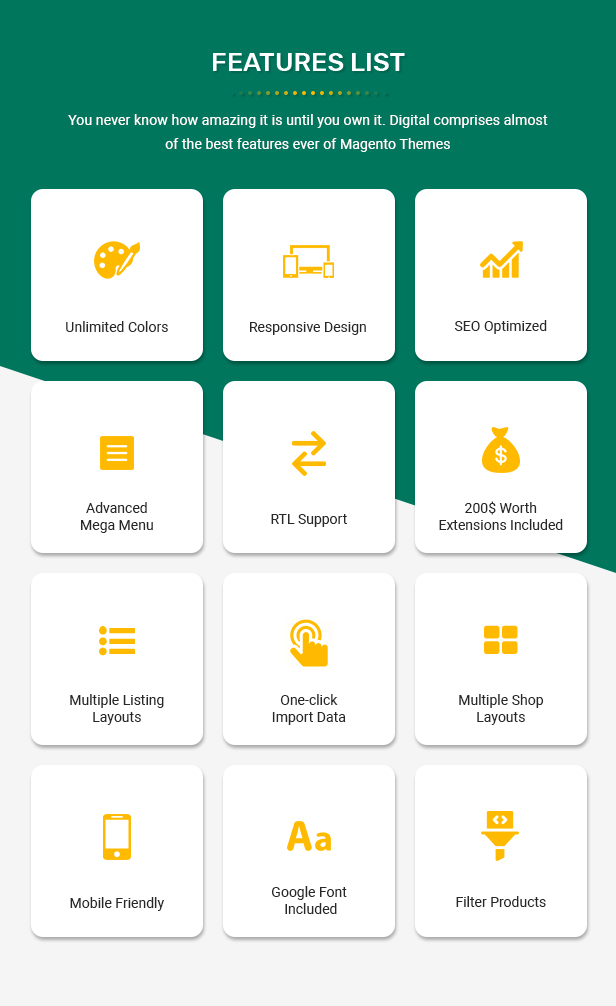 Empowered by the fantastic Magento 2 and various powerful eCommerce features, Digital helps you to build any beautiful website for almost store types without cost and time for coding.