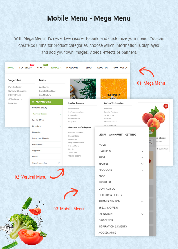• Support Mega Menu and Css Menu: