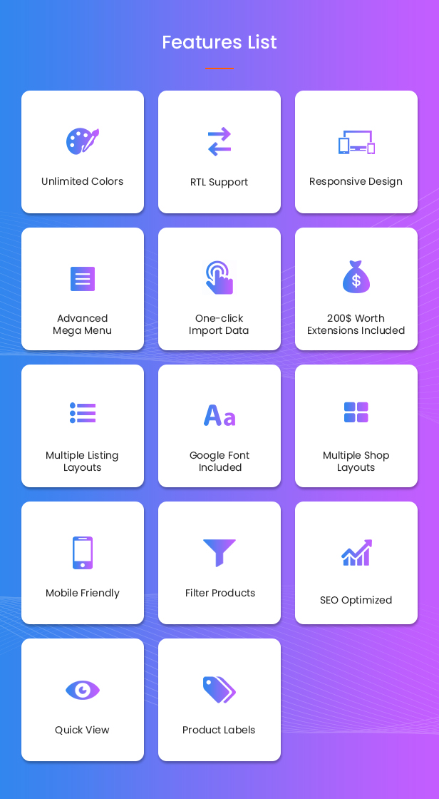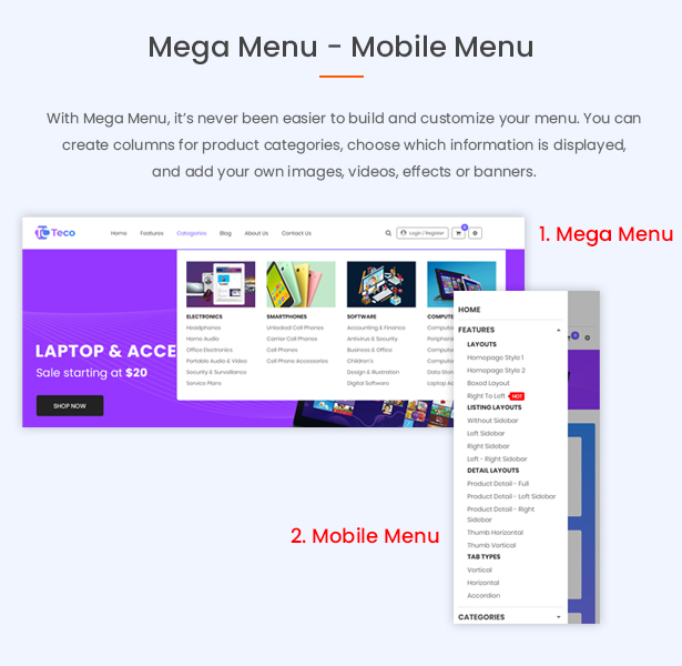 ✔️ Modern Design with Highly Customizable Features: Unique homepage, highly responsive, unlimited colors, Megamenu built-in, beautiful slider, countdown slider, featured product blocks, product listing tab, popup and more… etc.